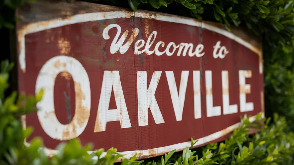 GPT-4o 交付;写道:“这张图片展示了一个复古风格的标志,上面写着‘欢迎来到奥克维尔’。标志看起来风化了,表面粗糙,陈旧,表明它已经暴露在风雨中一段时间了。文字采用红色背景上的粗体白色字体,有一些磨损的迹象,增加了它的怀旧魅力。标志部分被绿色植物包围,表明它可能被放置在户外,可能是在一个名为奥克维尔的城镇或社区的入口处。”