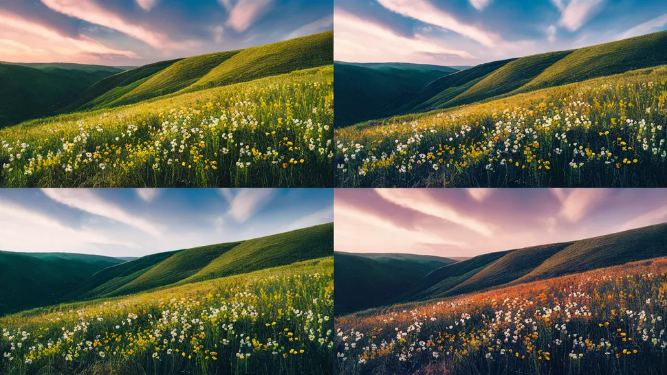文章继续道:“左上角的照片呈现柔和的粉色和蓝色渐变天空,暗示黎明或黄昏,山丘沐浴在温暖的金色光线中,衬托出鲜活的绿草和黄色、白色的花朵。右上角的照片展示类似场景,但色彩柔和,暗示清晨或傍晚。左下方的照片色调较冷,蓝色天空更明显,暗示中午的光线较柔和。右下方的照片更暖和、更饱和,粉红色天空暗示日落的暖光。光线和色调的变化展示了一天中不同时间和摄影技术对同一景观氛围和外观的影响。”