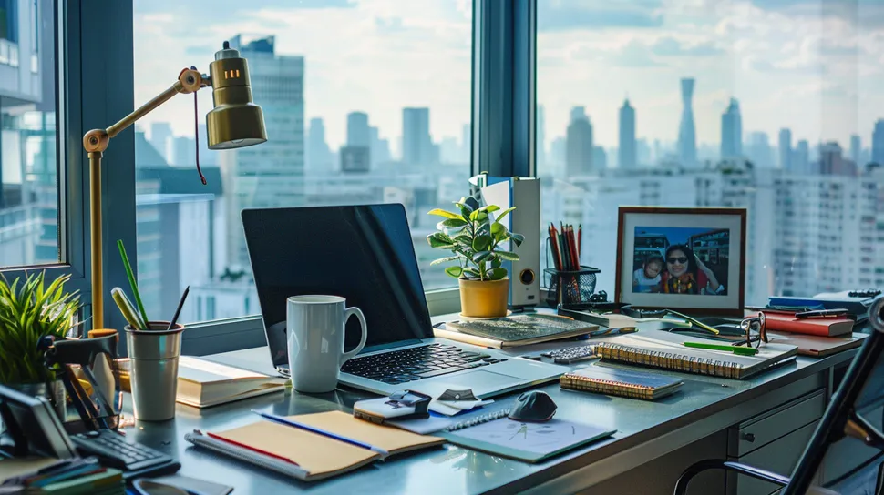 GPT-4o 写道:“这幅图描绘了一个现代化、井然有序的办公空间,背景透过大窗户可见城市景观。桌上整齐摆放着各种办公物品,包括一台位于中央的笔记本电脑、一盏金属台灯和一个咖啡杯,营造出轻松而专注的氛围。散落的笔记本和纸张表明人们在积极工作和做笔记,而一盆小盆栽增添了一丝绿意。桌上还有一张两人的相框照片,增添了个人色彩。办公空间备有钢笔、铅笔和记事本等,确保了办公的实用性。城市天际线与现代高层建筑的背景营造出充满活力和鼓舞人心的环境。”